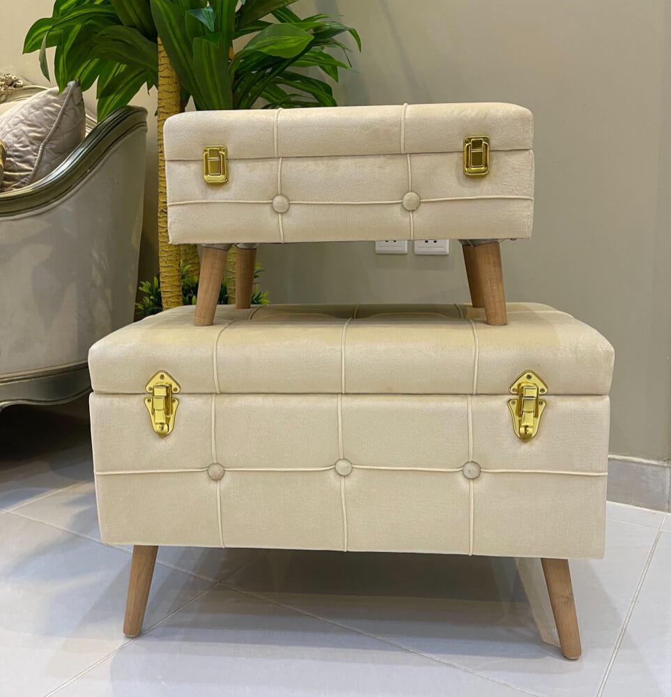 يتميز الصندوق بتصميمه الفاخر الذي يجمع بين المظهر الجميل والوظيفة العملية. المخمل الناعم يضفي لمسة من الفخامة، بينما الأرجل الخشبية توفر الاستقرار والقوة. الأحجام المختلفة تتيح لك اختيار الحجم المناسب حسب احتياجاتك، واللون البيج الكلاسيكي يتناسب مع معظم ديكورات المنزل.